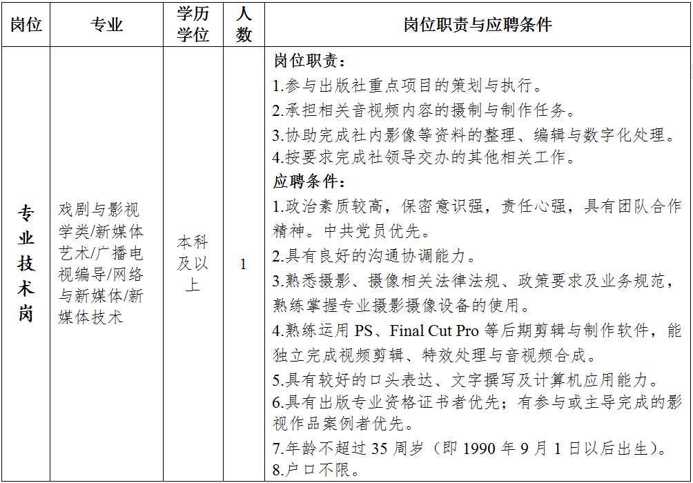 中国卫生科教音像出版社(以下简称“出版社”)是国家卫生健康委员会主管,中国健康教育中心主办的具有独立法人资格的全民所有制企业。结合实际工作需要,本次公开招聘聘用人员1名。现将有关事项公告如下: